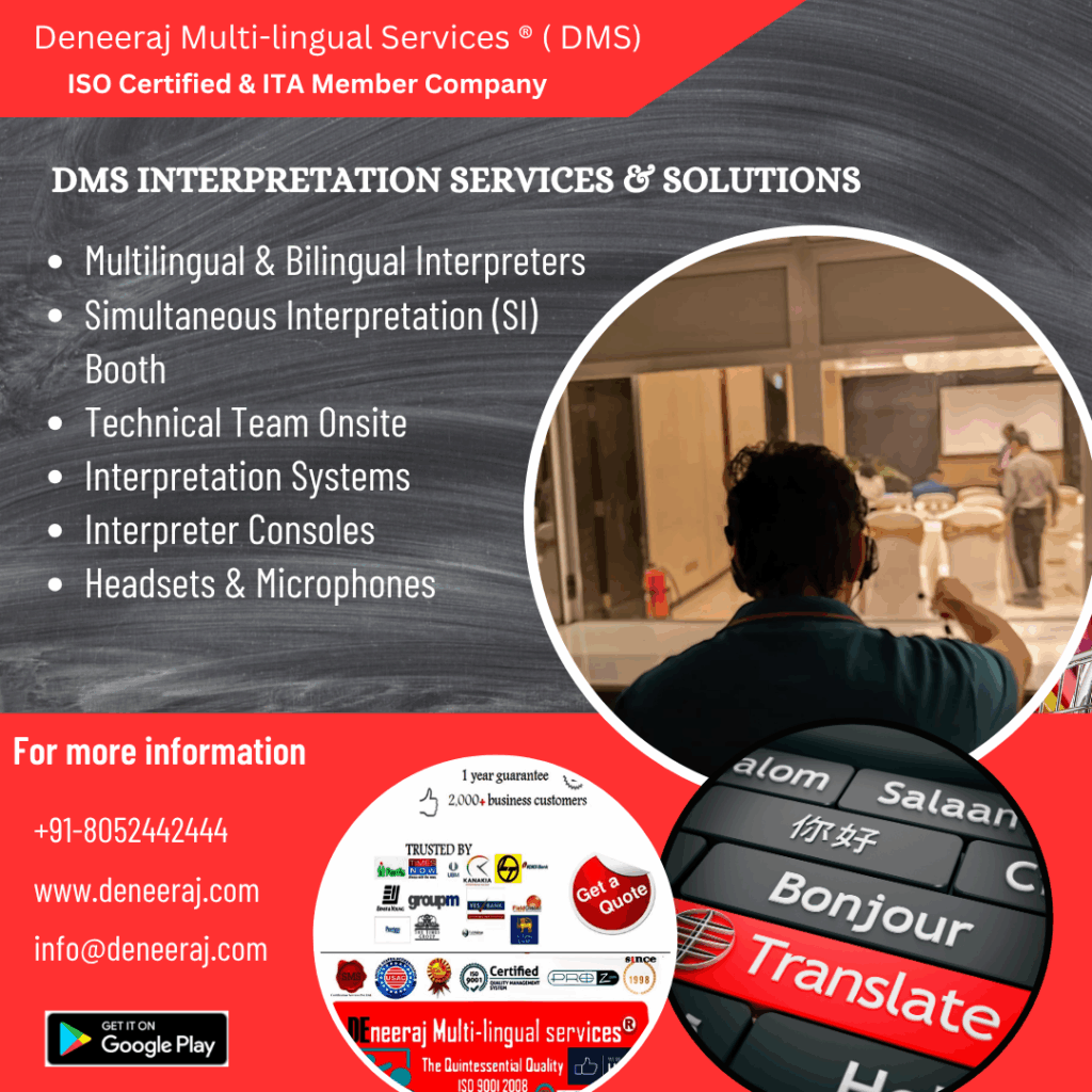 For more than 20 years DEneeraj Multi-lingual services® (DMS) has been providing Interpretation Systems & Translation Equipment in Mumbai, Delhi, Pune, and Bangalore, India to both national and international companies. We are a friendly, responsive Interpretation & Translation agency with professionals worldwide offering language Interpretation services with Simultaneous Interpretation Equipment.